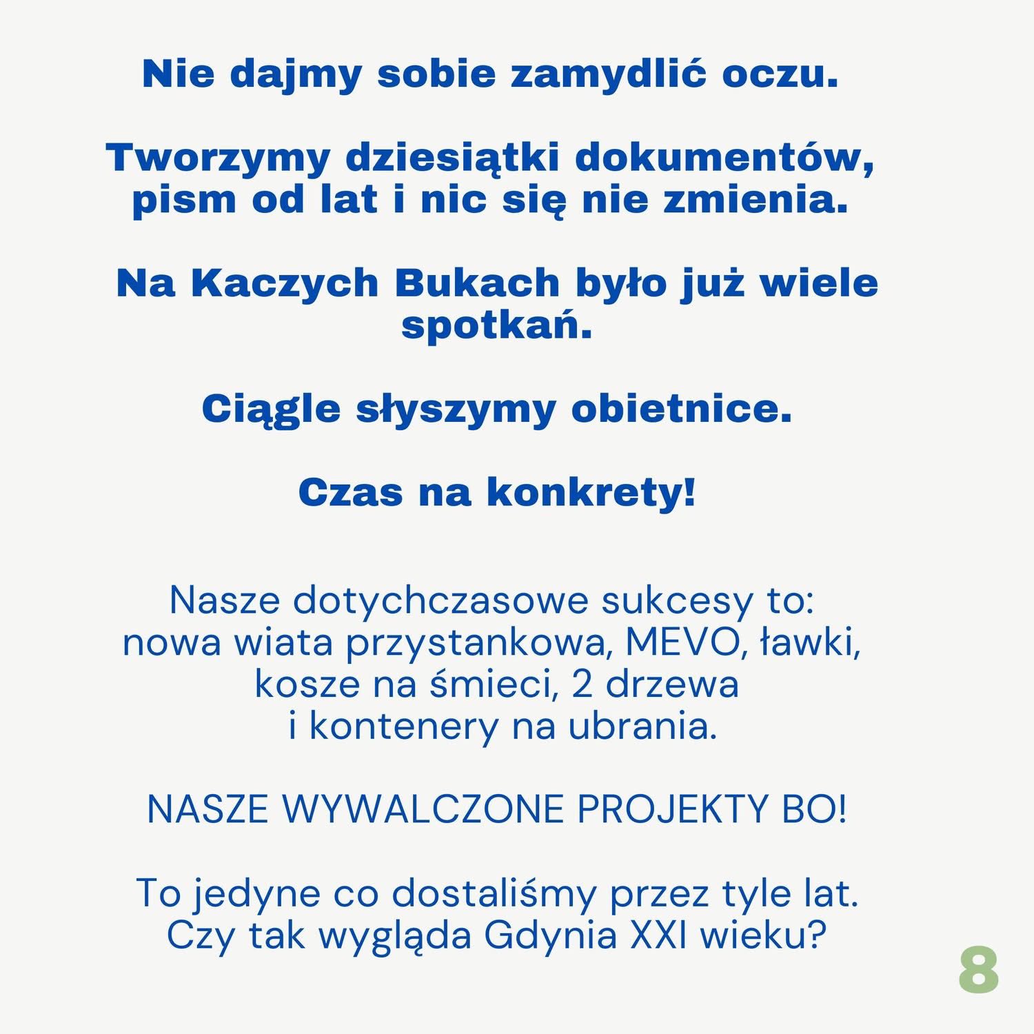 "Gdynia.pl - rozmawiajmy językiem faktów a nie PR-owych zagrywek i starajmy się przedstawiać rzeczywistość taką jaką jest, a nie jaką chcielibyśmy ją widzieć. Mieszkańcy Kaczych Buków zasługują na szacunek tak samo jak pozostali Gdynianie." - podkreśliła Anna Szpajer.